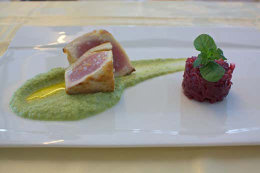 Ultimo ma non meno importante, Marco Cannizzaro, chef del Km0 di Catania, che ha incantato il pubblico presente con un'alalunga, una specie di tonno, ma dai sapori più delicati e più raffinati, accompagnata da crema di finocchi sul fondo del piatto e agro di lamponi, cipolla in agrodolce e due foglioline di menta.