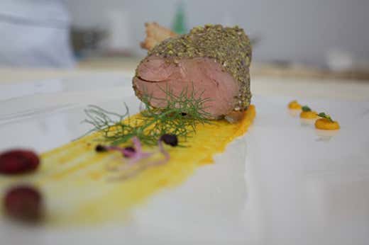 È il turno poi di Giuseppe Nicotra, chef a Trecastagni, amante della vera Sicilia, quella più autentica per tradizione a tavola, creatore di piatti dove immagini, profumi e sapori della sua terra ritrovano vita. Il piatto preparato è un Filetto di maiale cotto a basse temperature bardato al pistacchio di Bronte e composta di agrumi.