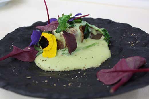 Un mignon di maialino nero cotto a bassa temperatura, souté di cime di rapa e spuma di macco di fave ai semi di finocchio riccio: questo il piatto di Elia Russo, chef del ristorante Le dodici fontane del Villa Neri Resort di Linguaglossa, terzo cooking show della domenica. Un piatto davvero "vulcanico" il suo, presentato su pietra lavica e decorato con foglioline di bietola e fiori colorati.