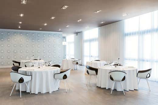 Il progetto è a cura dell’architetto Monica Melotti, che ha studiato la ristrutturazione e il design degli interni. La cucina, protagonista dello spazio, è racchiusa in un cubo di vetro rivestito da decori ricamati che danno vita a un gioco di volumi di estremo fascino. Elemento centrale di grande impatto, si fonde armoniosamente con la sala permettendo agli ospiti di intravedere cosa accade all’interno.