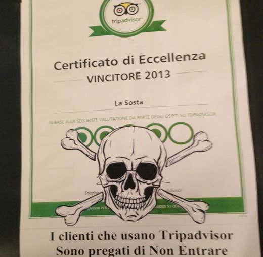 Un certificato di eccellenza di TripAdvisor come non si era mai visto. L'Osteria La Sosta di Cremona, ai classici pallini verdi sostituisce un adesivo con il simbolo del teschio con le ossa incrociate. E in basso il suo significato, conciso ma efficace: “I clienti che usano TripAdvisor sono pregati di non entrare”.