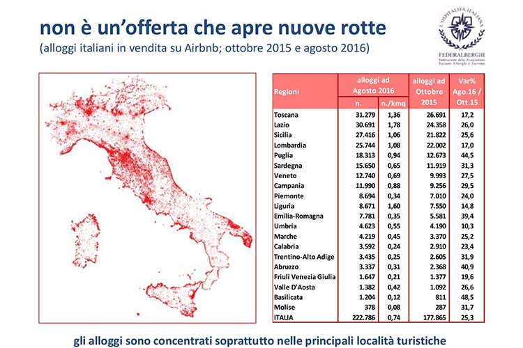 Tra le città italiane maggiormente interessate dal fenomeno troviamo Roma con 23.889 alloggi, Milano con 13.200, Firenze con 6.715, Venezia con 5.166 e Napoli con 3.040.