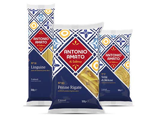 La pasta esitata dai pastifici equivale a 8 milioni di piatti di pasta al giorno! Il pastificio Amato, nell’individuazione di un posizionamento in giunzione ma non in sovrapposizione agli altri brand del Gruppo, coglie il considerevole asset della distintiva connotazione territoriale: Salerno con i suoi due affascinanti gioielli: la Costiera Amalfitana e il Cilento. Packaging di immediato appeal, giocato sui colori delle ceramiche vietresi.