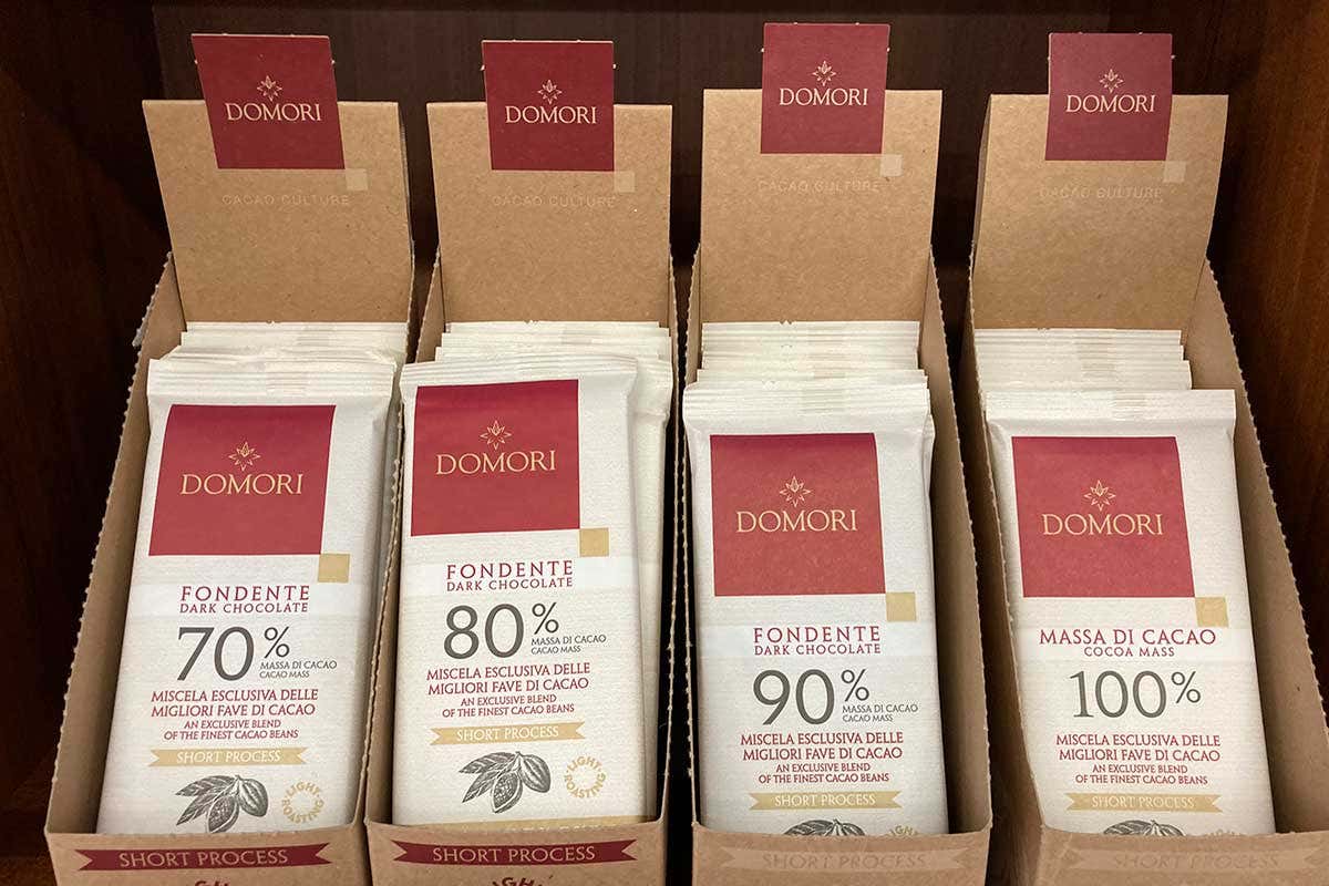 Oltre a ciò nelle lavorazioni tradizionali è necessaria una fase di concaggio, in cui si mescola a lungo il cioccolato prima di metterlo nello stampo per eliminare l’acidità in eccesso. Domori non utilizza il concaggio perché non ce n’è bisogno: questo metodo più rispettoso delle qualità naturali della materia prima rende inutile anche l’aggiunta di burro di cacao, lecitina di soia e vaniglia, perché gli aromi sono conservati dal tipo di lavorazione applicata. Si arriva al cioccolato aggiungendo zucchero in diverse percentuali alla massa di cacao liquida. Tradizionalmente si usano percentuali 50-50 o 30-70 e zucchero di canna grezzo: anche in questo caso Domori si differenzia con percentuali invertite, 70% di massa di cacao e 30% di zucchero o addirittura 100% di cacao, che risulta naturalmente più amaro e talvolta per questo stupisce i consumatori. Viene aggiunto zucchero di canna sbiancato perché il sentore di caramello dello zucchero grezzo potrebbe interferire con il cacao e mascherarne la qualità. Da ultimo il cioccolato liquido viene temperato e poi colato in tavolette o altri stampi che finiscono in frigorifero a pochi gradi di temperatura per solidificare prima di essere confezionati e imballati da una linea di macchine adatte. E’ infine nuovamente il turno della logistica: l’affascinante storia del cioccolato Domori lascia la fabbrica e si avvia agli scaffali della distribuzione e al consumatore finale.