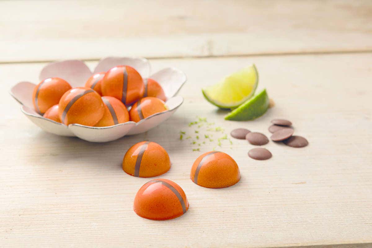 La Pralina Dolceamaro combina la freschezza dell'albicocca alla morbidezza di Ariba Zerolatte. La ganache, con polpa di albicocca e un tocco di scorza di lime, è racchiusa in un guscio decorato con eleganti spruzzi di burro di cacao colorato.