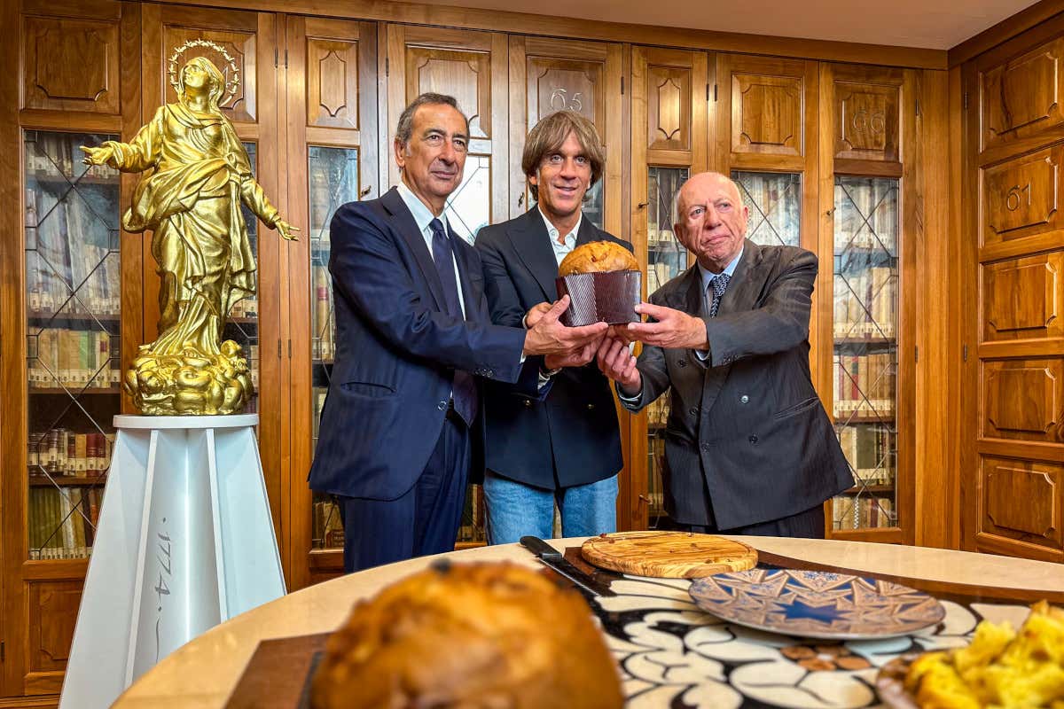 Beppe Sale, Davide Oldani e Fedele Confalonieri con il panettone D'Om de Milan