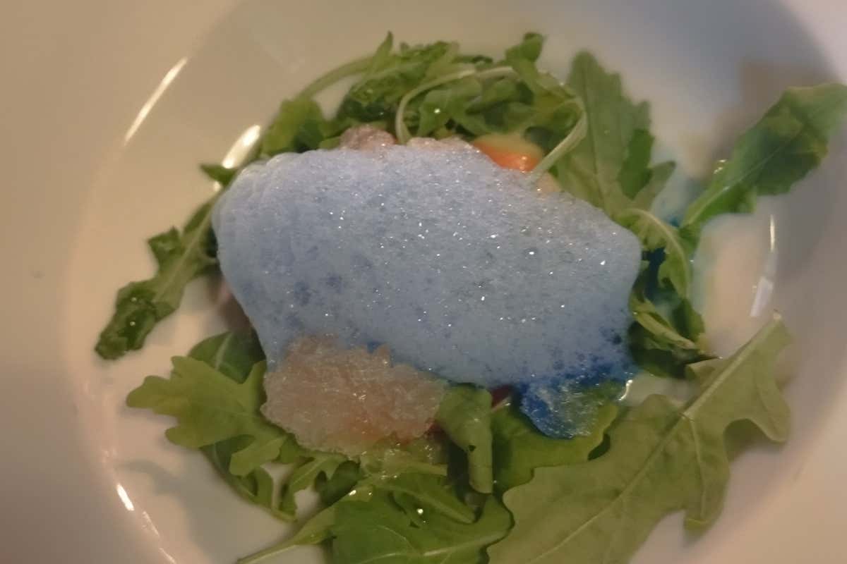 Mare di frutta, un carpaccio di salmone norvegese con mango, rucola, granita di bergamotto e gin,