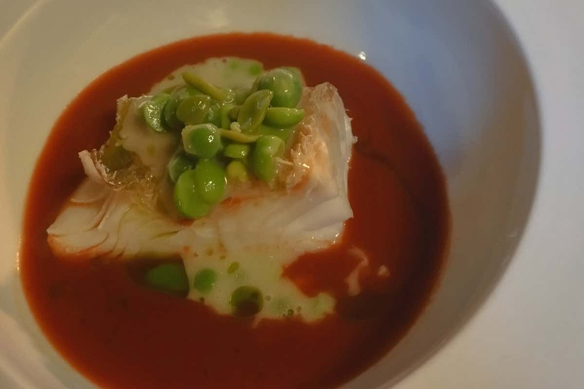 Zuppa di mare Ligure, con stoccafisso norvegese cotto a vapore accompagnato da piselli, fave e zenzero