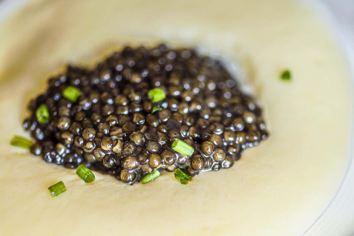 Come accennato da Alberto Messaggi, il caviale in degustazione presso Terrazza Duomo 21 è il “Tradition”, da storione bianco, specie originaria delle coste Nord-Americane dell’oceano Pacifico. È tra i pesci più longevi, in grado di arrivare a raggiungere i cento anni di età, gli 800 kg di peso e fino ai 6 m di lunghezza. Oltre che per la sua carne magra, bianca, ad alto contenuto proteico, è particolarmente apprezzato per la sua cospicua produzione di uova di grandi dimensioni, da 2,8 a 3,2 millimetri, con una colorazione che varia dal grigio scuro al nero.