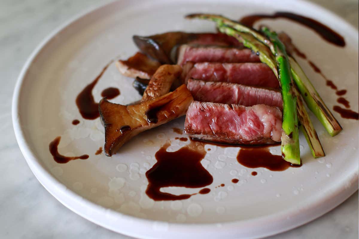 Tagliata di manzo alla griglia con funghi cardoncelli saltati, asparagi grigliati e Aceto Balsamico di Acetaia Sereni