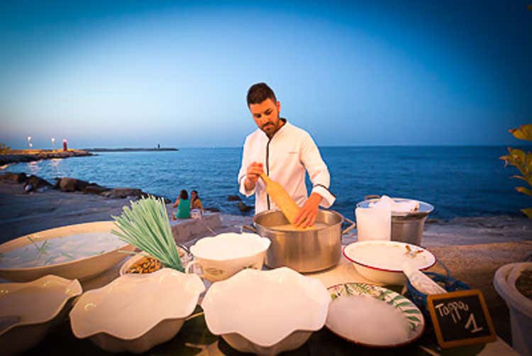 La serata proseguirà con un percorso a tappe costituito da punti di assaggio a base di pesce e di vino con Nino Ditrento, chef de “Il vecchio e il mare” che preparerà alcuni antipasti a base di pescato del giorno, mini hamburger con pesce azzurro ed un tubetto con la triglia, il tutto innaffiato dai vini: Pietrabianca Chardonnay e Fichimori Negroamaro dell’azienda Tormaresca; Garbino Moscato secco, Fiano e il Passito di Trani, dell’azienda Villa Schinosa. Un progetto curato da Francesca de Leonardis, consulente ed organizzatrice di cibo e vino, in collaborazione con i ragazzi de Il Vecchio e il mare.