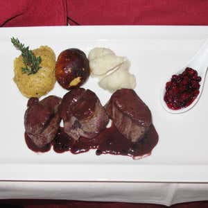 Ingredienti: 3 fette di filetto di cervo da circa 60 g ciascuna, 6 grani di ginepro, 4 cucchiai di grappa al Teroldego, 5 cl di vino Teroldego, 3 cucchiai di olio extravergine d'oliva, sale
