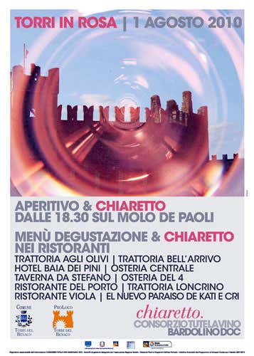 A 'Torri in rosa” - è questo il titolo dell'iniziativa, promossa dal Comune e dalla Pro Loco di Torri del Benaco in collaborazione con il Consorzio di tutela del Bardolino - aderiscono dieci ristoranti di questa splendida località costiera del Garda orientale: la trattoria agli Olivi, la trattoria Bell'Arrivo, l'hotel Baia dei Pini, l'Osteria Centrale, l'Osteria del 4, il ristorante del Porto, la trattoria Loncrino, il ristorante Viola, El Nuevo Paraiso de Kati e Cri e poi la Taverna da Stefano nella frazione di Pai.