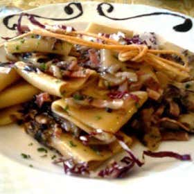 Ingredienti: pasta per lasagne, 300 g di radicchio rosso di Treviso, 50 g di pancetta affumicata, 100 g di formaggio grana grattugiato, 6 cucchiai di farina bianca, 30 g di vino bianco secco, 1 l di latte, 40 g di burro, olio extravergine d'oliva, 1 spicchio d'aglio, noce moscata, sale, pepe