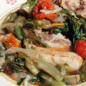 Preparazione: mondiamo la Cicoria all'acqua, laviamola, asciughiamola e mettiamola a cuocere per trenta minuti in abbondante acqua salata. Scoliamo la cicoria conservando l'acqua di cottura e lasciamola raffreddare. Aggiungiamo all'acqua di cottura la cipolla, il peperoncino, le costine di maiale, i pomodori da serbo giallo tagliati a metà, qualche goccia d'olio e un pizzico di sale. Cuociamo a fuoco lento per un'ora. Immergiamo le cicorie nel brodo e impiattiamo.