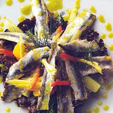 Ingredienti: 600 g di sarde fresche, sale marino, ghiaccio, 100 ml di Martini Dry, trucioli di legno, 100 g di finocchietto, 75 g di buccia di cetriolo olandese, 10 g di olio, peperoncino fresco, 10 ml di succo di limone, sale.