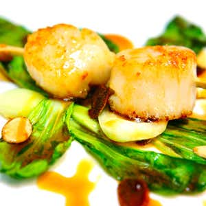 Preparazione: arrostire bene le ali di pollo a fuoco vivace in una bistecchiera. Portare a bollore il saké e il mirin in un pentolino. Abbassare il fuoco e aggiungere lo zucchero; unire la salsa di soia e le ali di pollo, riportare a bollore e cuocere per 30 minuti a fuoco basso fino a ottenere una salsa densa, scura e lucida. Filtrare con un colino, lasciare raffreddare e conservare in frigo. Foderare una teglia con carta da forno e disporvi le mandorle; passare in forno già caldo a 100°C. Preparare una soluzione di acqua e zucchero liquido al 50%, mettere nel vaporizzatore e spruzzarne un velo sulle mandorle. Spolverizzare con la cannella e spruzzare un altro velo di soluzione. Infornare e lasciare tostare. Eliminare le foglie esterne più dure dai ceppi di Pak Choi e lavare con cura quelle interne. Asciugare e conservare da parte. Privare le capesante del corallo e della corona. Formare 4 spiedini con 2 noci di capasanta ciascuno e salare solo un lato con il sale in fiocchi. Portare contemporaneamente in temperatura 2 padelle, una con l'olio di sesamo e l'altra con il burro salato. Adagiare gli spiedini sul lato salato nella padella con l'olio bollente e cuocere 1 minuto per lato. Mettere il Pak Choi nell'altra padella e appiattire la parte verde delle foglie che dovrà scurirsi. Disporre le foglie sul piatto, adagiarvi lo spiedo di capasanta e completare con le mandorle glassate e condite con la demi-glace all'orientale.