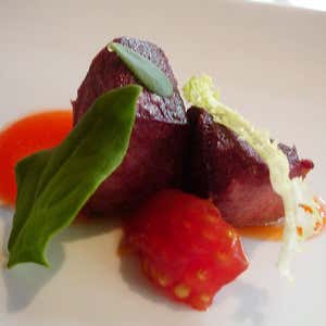 Preparazione: salmistrare una lingua di vitella a secco con sale grosso massaggiandola e girandola più volte al giorno a temperatura di 0-4 °C per una settimana. Sciacquarla sotto acqua corrente per una notte, confezionarla sottovuoto e cuocerla a 60 °C. Tagliarla a cubetti e rosolarla in padella. Per la salsa, unire in un polsonetto il Moscato d'Asti, l'aceto di vino bianco, l'acqua, 3 pizzichi di sale, i chiodi di garofano, la cannella e le bacche di ginepro. Portare il tutto a ebollizione, coprire con pellicola e lasciare in infusione per 12 ore a temperatura ambiente. Filtrare, aggiungere l'agar-agar e la colla di pesce, riportare a ebollizione, raffreddare e frullare fino a ottenere un composto liscio e omogeneo. Aggiungere a 1 cucchiaio di questo composto 1 cucchiaio di succo di peperone rosso centrifugato. Velare il piatto con la salsa, disporvi i cubi di lingua, aggiungere il cuore di pomodoro rosso e decorare con foglie di insalata riccia e tetragonia.