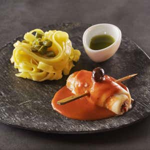 Preparazione: preparare il ripieno con pomodorini, capperi, olive, olio, lemon-grass o scorza di limone, sale e pepe. Far leggermente appassire il tutto a crudo per qualche minuto, frullare e spalmare l'interno dei filetti di Platessa. Fare degli involtini, salarli e sistemarli in una teglia da forno e cuocerli per 8 minuti a 220°C. Lavare e tagliare gli asparagi. Le punte possono essere usate, leggermente, sbollentate e marinate in olio extra vergine e usate successivamente come decorazione. In una pentola per la pasta mettere a bollire dell'acqua salata e cuocere le tagliatelle. Scolarle e saltarle con gli asparagi, il burro e il parmigiano. In un piatto di portata, creare un cilindro con le tagliatelle, unirvi l'involtino di platessa e decorarlo on la salsa derivata dal ripieno della Platessa, in una ciotola versare l'olio al basilico.