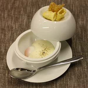 «Ho lasciato Bogotà troppo presto - dice - avevo solo 16 anni. Certamente c'è una memoria gustativa dentro di me, il sapore di un piatto che faceva mio nonno siriano a base di carne, bulgur e menta. Ma ho girato tanto il mondo, mi sono immerso in tutte le cucine regionali italiane, diverse e infinite. è solo la materia a ispirarmi». Lo dimostra nella sua Carbonara, piatto sacro ai romani, che non ha esitato a dissacrare rendendolo sublime. è la cremosità dell'uovo e il croccante del guanciale a deliziare nel più classico dei primi? Ebbene, Caceres ha lavorato su questi sapori, concentrandoli. Ha cotto l'uovo a bassa temperatura (65 gradi per 40 minuti), sifonato e riscaldato parmigiano e pecorino, saltato il guanciale. Il colpo si scena è sulla pasta: cotta per 50 minuti, seccata per due giorni e infine fritta a 190 gradi. Nasce così l'Uovo 65 Carbonara (nella foto a destra), servito in una sfera di ceramica bianca che sembra proprio un uovo.