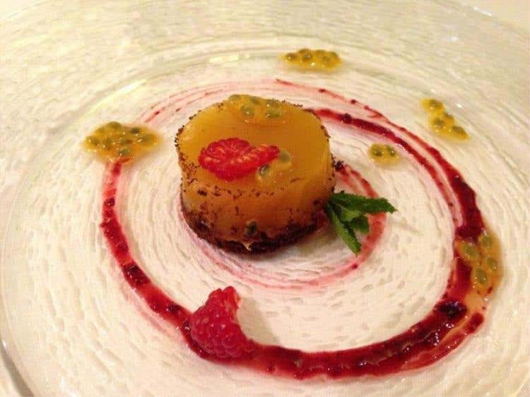 Per i primi lo chef propone, oltre alle pietanze disponibili a pranzo, i ravioli ripieni di burrata con salsa all’amatriciana (vedi foto), pasta e patate alla partenopea, spaghetti alle vongole con bottarga e polvere di capperi e tagliatelle al ragù di anatra con mandorle tostate. Tra i piatti di pesce, la ricciola bruschettata con riso venere e pomodorini roesti, la zuppetta di pesce del Mediterraneo e il fritto misto di pesce con maionese e birra al coriandolo. Per i piatti di carne filetto di manzo con patate, asparagi e salsa al vino rosso di Valpolicella e il filetto di vitello agli agrumi di Sicilia con spinaci saltati e tortino di patate e lo speciale duetto d’anatra che comprende coscia d’anatra confit su tortino di patate e il petto d’anatra arrostito ai frutti di bosco.