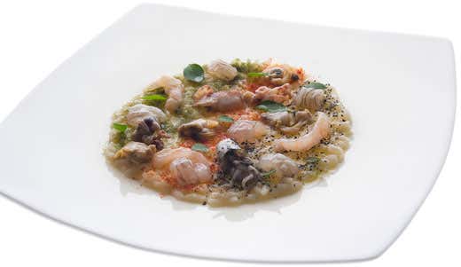 Preparazione: tostare il riso in un tegame con un filo d’olio extravergine d’oliva, sfumare con del vino bianco e cominciare la cottura bagnando con il fumetto di pesce. Scottare le seppioline i calamaretti e gli zotoli in una padella antiaderente, marinare il resto dei pesci con pochissimo zucchero e una macinata di pepe. Verso la fine della cottura mantecare il risotto con il brodo concentrato di pesce, l’olio extravergine d’oliva e pepe bianco; stendere sul piatto il risotto e fare tre strisce con le tre polveri mettere sopra il pesce e ultimare il piatto con le erbe e un filo d’olio extravergine di oliva.