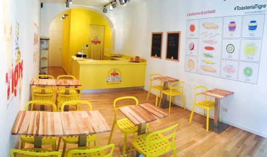 Il locale è piccolo e dallo stile minimal-underground ma è impossibile non notarlo per via del suo colore dominante: quel giallo che è poi lo stesso riconoscibilissimo colore della famosa tigre simbolo del brand. Il protagonista qui è ovviamente il formaggio “Tigre Original Swiss Quality” che valorizza i ben 20 toast in menu (cui si aggiungono anche 7 panini), come il Tigre “Lo Zanza”, “La Sciura” o il “Ruggente”, perché tutti ovviamente a base di formaggi e fettine Tigre.