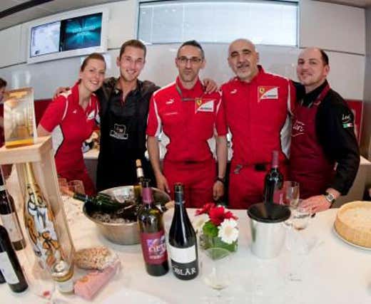 Cristian Specogna (nella foto, il secondo da sinistra), produttore vinicolo che ha le coltivazioni sulle colline della Rocca Bernarda, e Levi Gregoris (nella foto, il primo da destra) maestro d’arte nella produzione del San Daniele hanno dato vita ad un perfetto abbinamento nel paddock della scuderia Ferrari durante il recente gran premio in Austria, un evento che sarà bissato dal 25 al 27 luglio in occasione del GP d’Ungheria.