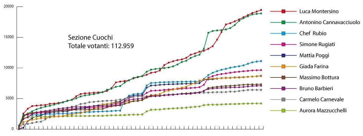 Dal grafico è evidente che, per quasi tutta la durata del sondaggio, i candidati che hanno dominato costantemente la graduatoria sono Luca Montersino e Antonino Cannavacciuolo. Il pasticcere e lo chef si sono avvicendati più volte al comando della classifica, distanziando di molto tutti gli altri candidati. Montersino alla fine è uscito vincitore con 19.462 preferenze, contro le 18.895 di Cannavacciuolo. Clicca sull'immagine per ingrandirla.