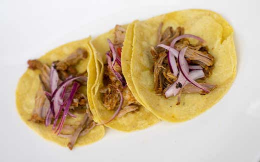 Preparazione: si prende la gamba del maiale si taglia farcendola con i gusti, si marina con sale, succo d’arancia, limone e arancia rossa con achiote e il fondo rosso si lascia riposare un giorno. Dopo questo giorno di riposo si cuoce la carne con tutte le erbe e lo strutto a 180 gradi per sette ore sempre coperto con foglie di platano intervallato da carta d’alluminio. Si preparano le “Tortillas” con la piastra e si servono con cipolla rossa. Cipolla rossa: succo di limone-origano e chile habanero. Si marina nel succo di limone per 1 ora.