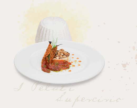 Preparazione: tagliare a metà i Pelati e tenerne il succo. Salare leggermente e rosolare le falde dei Pelati in una padella antiaderente con un filo d’olio. Arrostire la cagliata di capra. Emulsionare il succo dei Pelati con un pizzico di sale e due cucchiai di olio.