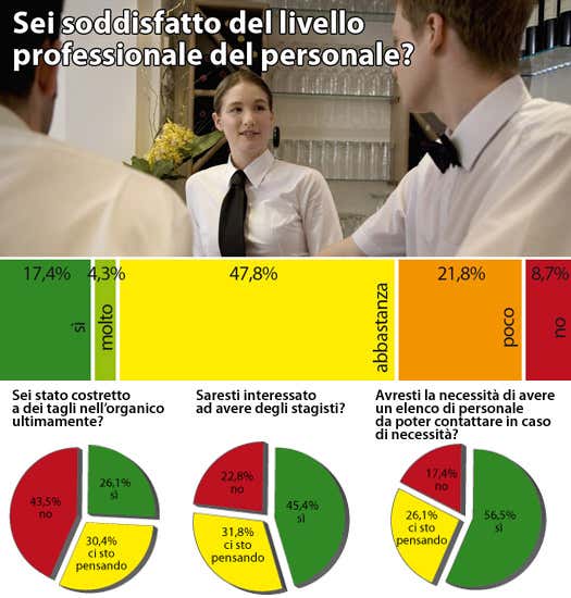 Al momento emergono anche problemi sul personale. Se dal sondaggio emerge una soddisfazione sul livello professionale (fra molto a abbastanza siamo ad oltre il 70%), tanto che un 43,5% non ha effettuato tagli fra i dipendenti, un altro 26,1% però ha già ridotto il personale e un altro 30,4% ci sta pensando. C'è un forte interesse in ogni caso per la possibilità di avere stagisti o personale temporaneo in caso di necessità (45,4% nel primo caso e 56,5% nel secondo).