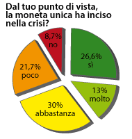 Sulla crisi avrebbe inciso, e forse era un po' scontato considerando la grande strumentalizzazione anche politica fatta nei mesi scorsi, anche l'introduzione dell'euro, indicato come causa prevalente della crisi con un sì dal 26,6% degli intervistati, con molto dal 13% e abbastanza dal 30%. Influenza di poco peso per il 21,7% o nulla solo per l'8,7%.