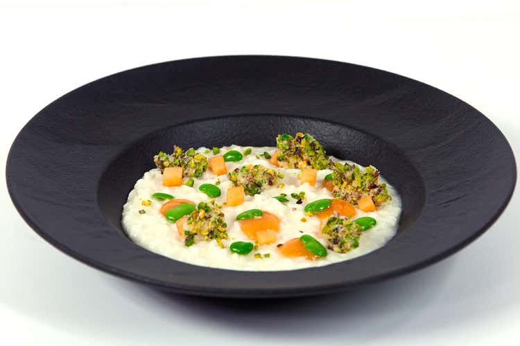 Fatto tostare il riso con l’olio allo scalogno l’ho coperto con il brodo vegetale, e tolto dal fuoco l’ho mantecato con burro e Grana Padano Riserva grattugiato. Dopo averlo impiattato, ho decorato con cubetti di melone marinati, favette fresche spellate, sfoglie di grana e pistacchi e gel di melone.