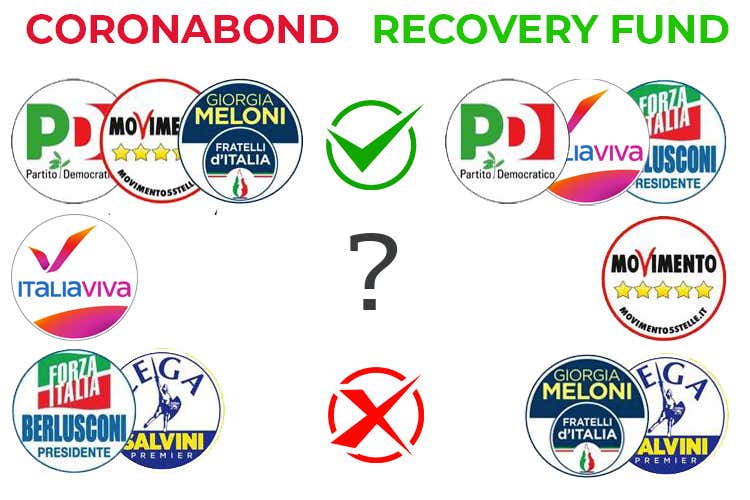 Un'Italia divisa, frammentata al Parlamento Ue nel votare l'azione coordinata dell'Unione per fronteggiare la crisi da pandemia di Covid-19. Prima i coronabond: a sinistra Partito Democratico e Movimento 5 Stelle hanno votato a favore, Italia Viva si astiene, Fratelli d'Italia vota sì staccandosi dalla destra di Salvini (Lega) e Berlusconi (Forza Italia) che "remano contro le volontà" del Governo e dicono no. Poi il recovery fund: Lega ancora contro, che ritrova la compagnia di Fratelli d'Italia ma perde l'appoggio di Berlusconi che stavolta vota sì insieme a Italia Viva e Partito Democratico. Si spacca invece la maggioranza del Governo, con l'astensione del M5S (con però tre deputati che votano addirittura contro).