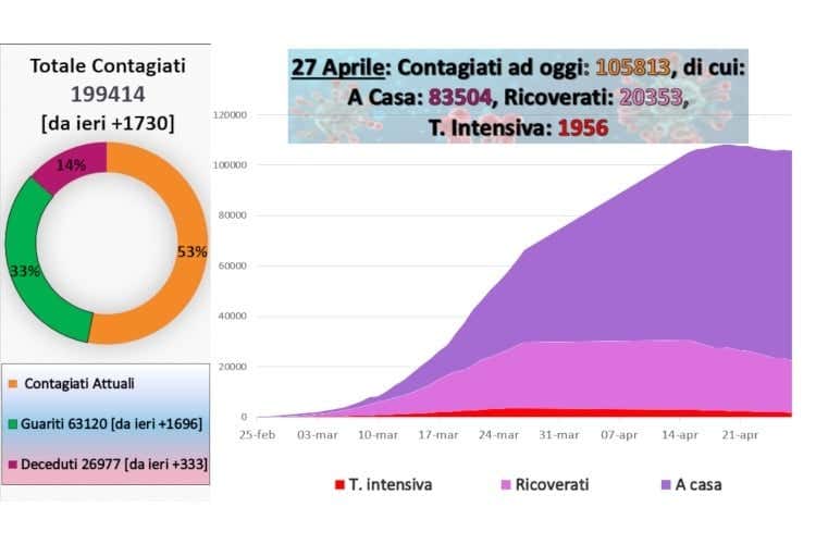 Secondo il bollettino odierno della Protezione civile, i casi totali di contagio da coronavirus in Italia sono199.414 (+1739 rispetto a ieri); i deceduti ad oggi sono 26.977, con 333 morti nelle ultime 24 ore. Tornano a calare i malati: ad oggi sono complessivamente 105.814, 290 meno di ieri. L'incremento ieri era stato di 256 mentre sabato c'era stato un calo di 680 malati. Prosegue ancora il trend in calo dei ricoveri in terapia intensiva per coronavirus e per la prima volta dal 16 marzo il numero scende sotto i duemila. Ad oggi sono 1.956, 53 in meno rispetto a ieri. Di questi, 680 sono in Lombardia, 26 in meno rispetto a ieri. Dei 105.813 malati complessivi, 20.353 sono ricoverati con sintomi, 1.019 in meno rispetto a ieri - il numero più alto dall'inizio dell'emergenza - e 83.504 sono quelli in isolamento domiciliare, 782 in più rispetto a ieri.