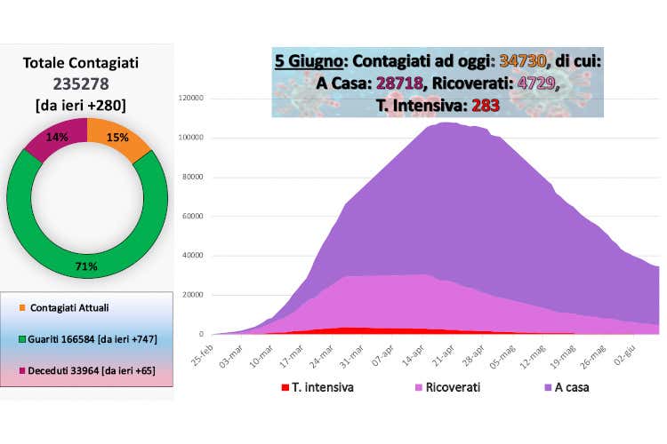 Sono 280 i nuovi casi di contagio da coronavirus in Italia secondo il bollettino odierno della Protezione vicile. In totale i contagiati salgono a 235.278. Nelle ultime 244 ore si sono registrati 65 morti (33.964 in totale). In sette regioni nessun nuovo caso. Le persone guarite nelle ultime 24 ore sono 747, per un totale di 166.584. Continuano inoltre a diminuire i pazienti ricoverati in terapia intensiva: sono 283, cioè 4 in meno rispetto a ieri. Le persone ricoverate con sintomi sono 4.729 (-135). Sono invece 29.718 le persone in isolamento domiciliare (-393). Questi i contagiati ad oggi in Lombardia, provincia per provincia: Bergamo 13.588 (+7), Brescia 15.007 (+19), Como 3.922 (+1), Cremona 6.495 (+6), Lecco 2.766 (+0), Lodi 3.500 (+2), Monza e Brianza 5.573 (+2), Milano 9.942 (+23), Mantova 3.388 (+0), Pavia 5.416 (+12), Sondrio 1.488 (+7), Varese 3.693 (+19).