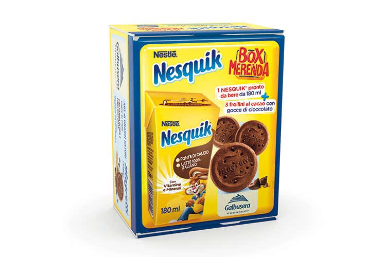 Formato: un brik di Nesquik pronto da bere da 180ml e una confezione da 16g composta da tre frollini Magretti Galbusera al cacao con gocce di cioccolato.