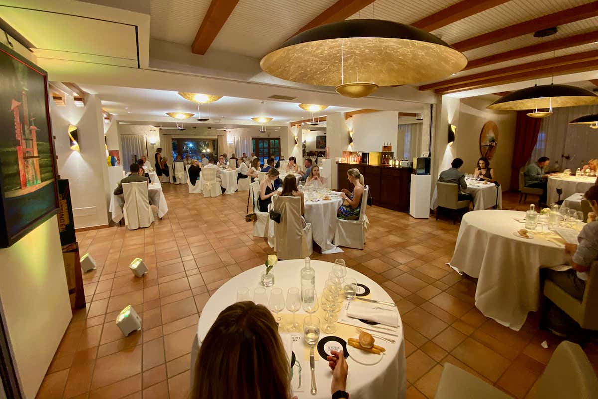 La cena si è svolta all’interno delle eleganti sale del ristorante, circondate dalle opere d’arte dell’artista Toni Zanussi. Le tavole sono allestite con mise-en-place di grande effetto e ricercatezza. Notiamo con piacere che i calici sono stati disposti in ordine di abbinamento ai piatti, con indicati i riferimenti di anno e produttori dei vari vini. L’esperienza iniziata con uno speciale benvenuto della cucina creato a otto mani che crea un curioso gioco circolare: un percorso rotondo, abilmente sostenuto dalla Ribolla Gialla Spumante Brut Millésimé 2017 Collavini.