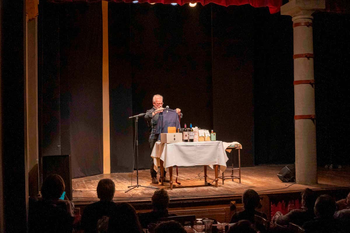 Fra le tante allettanti situazioni ci ha particolarmente incuriosito la Cena evento al Teatro del Sale, il Circo-lo Creativo di Intrattenimento culturale di Cibrèo Città Aperta 2002 Firenze. La bomboniera tanto cara a Fabio Picchi e a Maria Cassi che ne cura la direzione artistica da sempre e ancor più coinvolta se possibile dal 25 febbraio 2022, giorno in cui Fabio ci ha lasciato. Un cartellone sempre in movimento con le performance di Maria che si alternano ad esibizioni che svariano in ogni ordine di direzione culturale. E “Galeotto fu il Risotto!” si inserisce perfettamente in questo filone come appuntamento collaterale fra gli eventi “Fuori di Taste”. Un autentico istrione Leonardo Romanelli, noto volto televisivo per i suoi interventi a Geo and Geo (spesso in compagnia dello stesso Fabio) e firma di punta nelle pubblicazioni del Gambero Rosso. Nel suo monologo racconta la vita di un cuoco sbeffeggiando le mode susseguitesi nel tempo, dal sacrilegio della panna nella Carbonara, alle storture della nouvelle cuisine, alla tristezza della Bresaola con la Rucola della Milano da bere, per non parlare dell’abuso ossessivo delle cotture a bassa temperatura che, ormai, ostentano quasi dappertutto per darsi un tono.