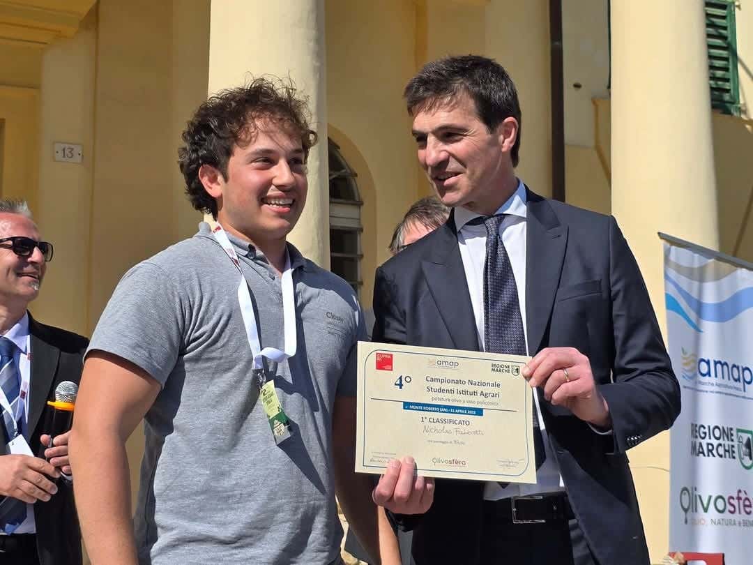 Nicholas Fabbretti, studente dell'Istituto Agrario Cuppari Salvati, ha ottenuto il premio come miglior studente in gara tra i professionisti. Ha consegnato il premio il governatore Acquaroli
