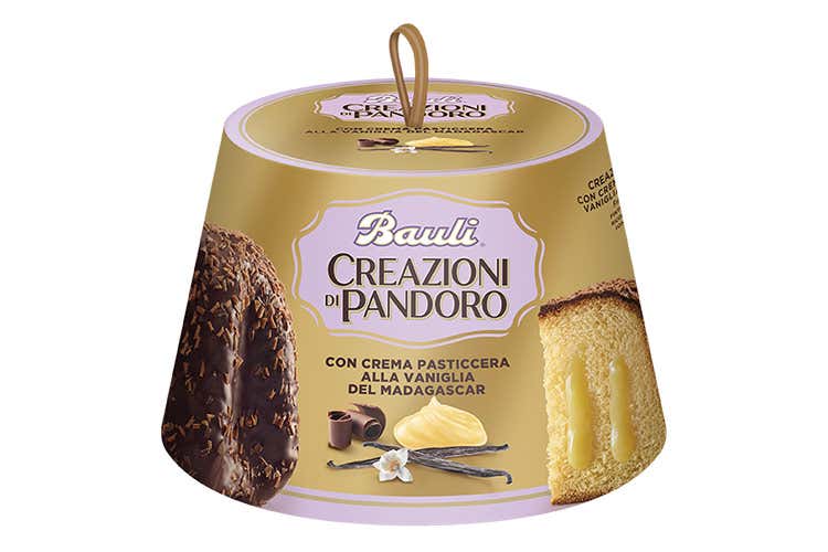 Pandoro con crema pasticcera alla vaniglia bourbon del Madagascar ricoperta di cioccolato fondente e decorazioni di cioccolato al latte. Una novità firmata Bauli per gli amanti del pandoro farcito. Formato 800 grammi. Prezzo consigliato al pubblico 8,40 euro.