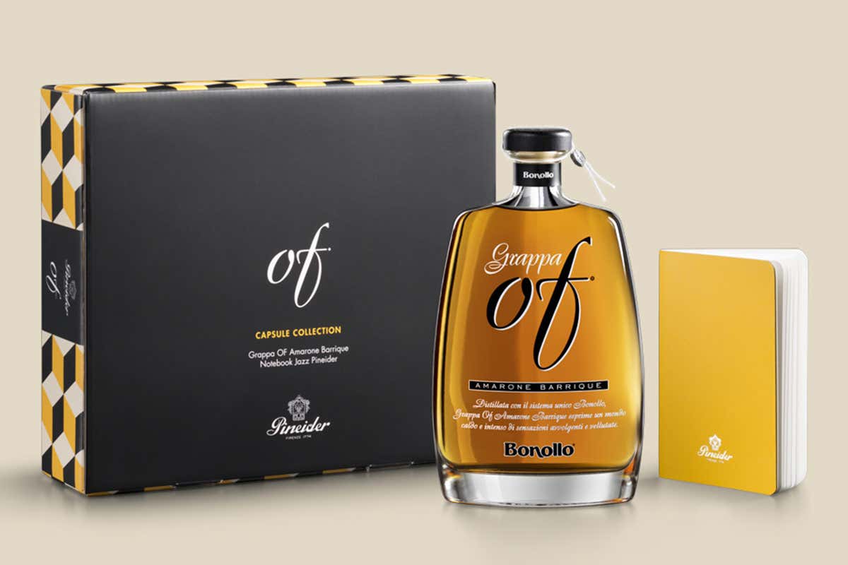 Le Distillerie Bonollo Umberto di Padova si dedicano all’arte della distillazione da oltre 100 anni e quattro generazioni proponendo distillati di alto valore edonistico, di cui la Grappa OF Amarone Barrique è la massima espressione. Questo gioiello dal profilo sensoriale sorprendentemente intenso, morbido ed elegante, racchiuso in una bottiglia originale, si presenta in un cofanetto unico insieme all’agenda Quaderno Jazz firmata Pineider, azienda nata nel 1774 a Firenze e specializzata nella creazione di carta da lettere, strumenti per la scrittura e pelletteria di alta fattura.