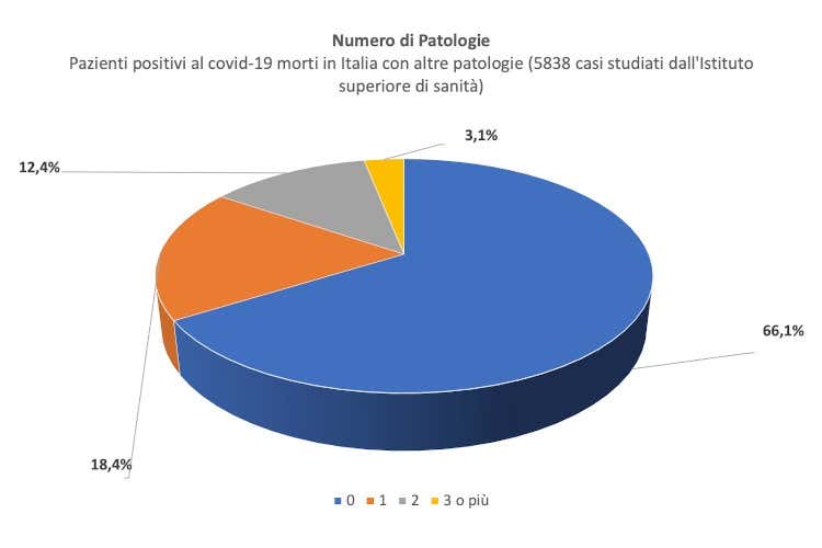 E se la parola secondo Conte deve passare ai tecnici, va ricordato allora che secondo l’Istituto superiore di Sanità, al 9 dicembre, l’età media dei morti positivi a Sars-CoV-2 era di 80 anni (l’età media è di 82). Un livello più alto di oltre 30 anni rispetto a quella dei pazienti che hanno contratto l’infezione. Dai dati su 5838 decessi, dei quali si sono analizzate le cartelle cliniche, l’Istituto superiore di Sanità ha poi rilevato che il numero medio di patologie osservate nei pazienti morti di Covid è di 3,6. In pratica 182 pazienti (il 3,1% del campione) non avevano altre patologie, 724 (il 12,4%) presentavano una patologia, 1077 (il 18,4%) ne presentavano 2 e 3855 (ben il 66,0%) ne presentavano 3 o più. Questa analisi l’abbiamo riportata nel grafico, ma ci chiediamo: davvero questi casi possono rappresentare l’intera realtà?  Parliamo di meno del 10% dei morti… e il resto?