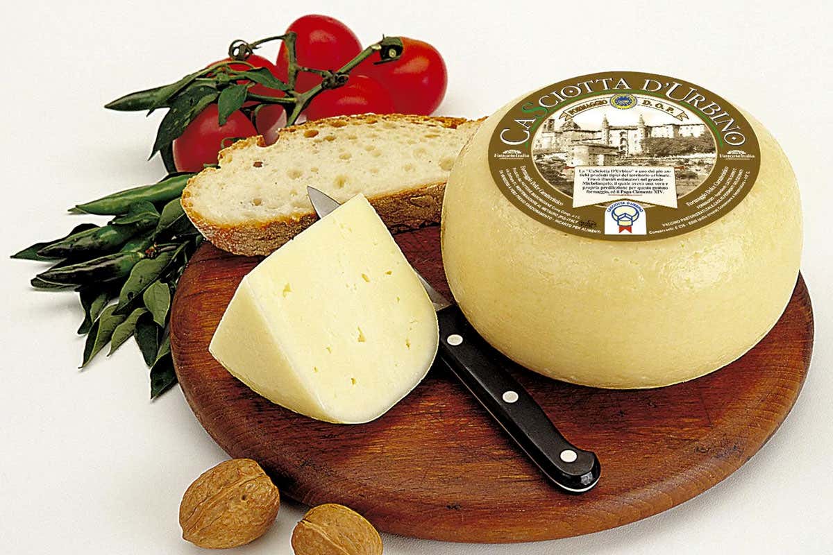 È un formaggio prodotto con il 70-80% di latte ovino intero e con il 20-30% di latte vaccino provenienti da allevamenti ubicati nella zona di produzione. La zona di produzione della Casciotta d’Urbino Dop comprende l’intero territorio della provincia di Pesaro e Urbino, e alcuni comuni della provincia di Rimini. Il nome Casciotta deriva da cascio, variante linguistica territoriale del termine “cacio”. Si tratta di un formaggio di origini antiche, prodotto già nel XV secolo, ai tempi dei duchi di Montefeltro e Della Rovere. Costoro dedicavano particolare attenzione alla produzione casearia, come si evince dalle numerose norme delle “Costituzioni del Ducato di Urbino” su tale produzione focalizzate. Si pensi che l’abbondanza di pascoli e di ovini, era tale da consentire il pedaggio minimo e irrisorio di un danaro La produzione casearia costituiva oggetto di commercio con lo Stato Pontificio. La Casciotta d’Urbino era spesso presente ai grandi convivi e banchetti di nozze dei nobili dell’epoca. Secondo la tradizione anche Michelangelo apprezzava molto questo formaggio, soprattutto quello poco stagionato. Il latte viene coagulato a 35°C con caglio animale con eventuale aggiunta di fermenti lattici.