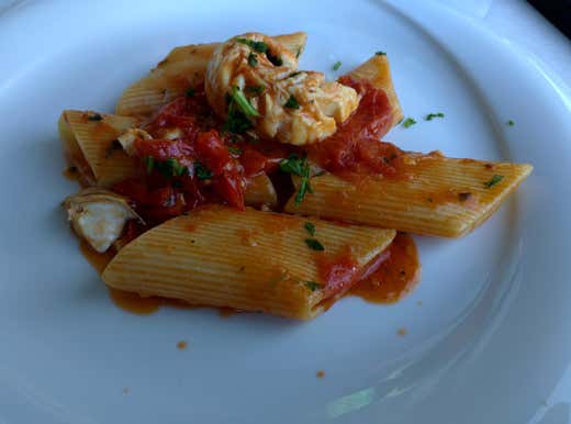 E dopo mezza pizza margherita, e mezzo calice di Biancolella, potrebbe non essere il momento di un eccellente primo piatto? E, stante la navigata maestria dello chef, potrebbe non risultare eccellente un primo piatto dove la pasta è data dai pennoni rigati del Pastificio Gentile ed il pesce che il tutto nobilita è un coccio freschissimo? Doviziosa la pesca, pesante la rete, altro coccio freschissimo sostanzia ottimo secondo, impeccabilmente eseguito: il coccio all'acqua pazza. E siamo al dolce. In sembianza di torta, corpulenta la rivisitazione, originale l'interpretazione: ecco a noi il marron glacé. Ci piace.