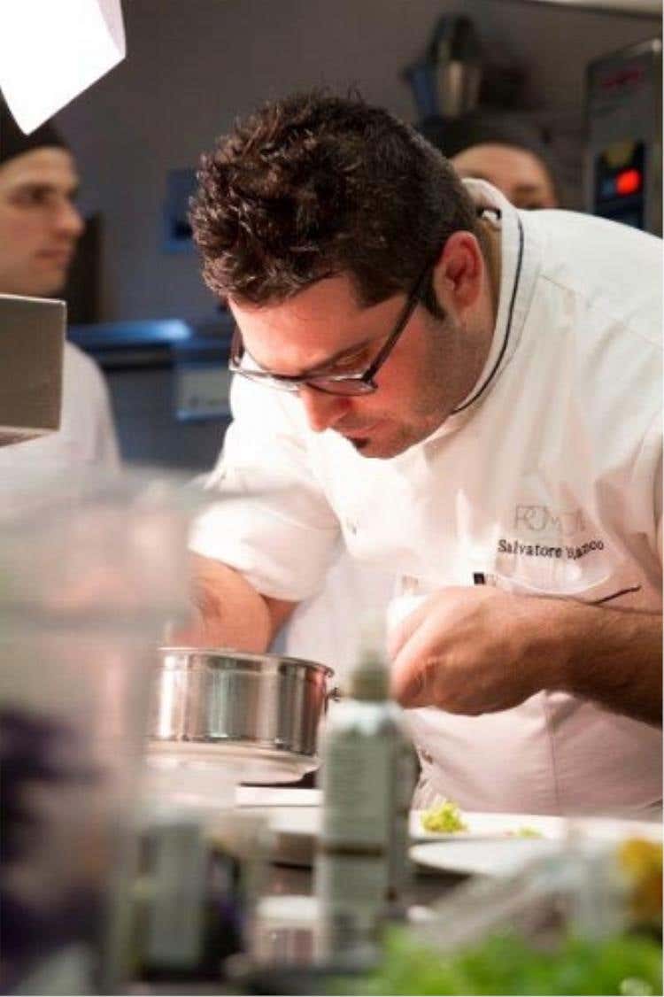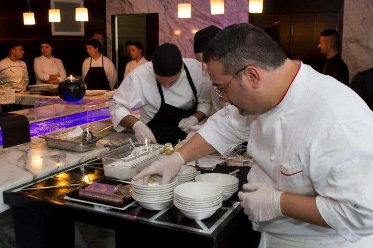 nella foto, quarto da destra) che propone intrigante piatto: Tataki di ricciola, zucca al Martini dry e zenzero. Anche Pasquale Palamaro è testimonianza precisa dell'eccellenza della ristorazione alberghiera. Il suo ristorante Indaco è annesso al famoso Albergo della Regina Isabella, in quel di Lacco Ameno, nell'isola di Ischia. Sorprendente la performance dell'unico chef non campano, lo stellato