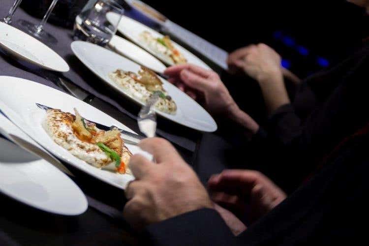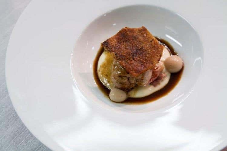 nella foto, secondo da destra): Maialino da latte con cottura laccato alla birra Sesonella, crema di patate e gnocchi liquidi di funghi porcini. Dalle Eolie una pietanza non marinara! È esecuzione pregevole, è squisito il piatto. Ed ancora un caso di ristorante annesso a struttura alberghiera.