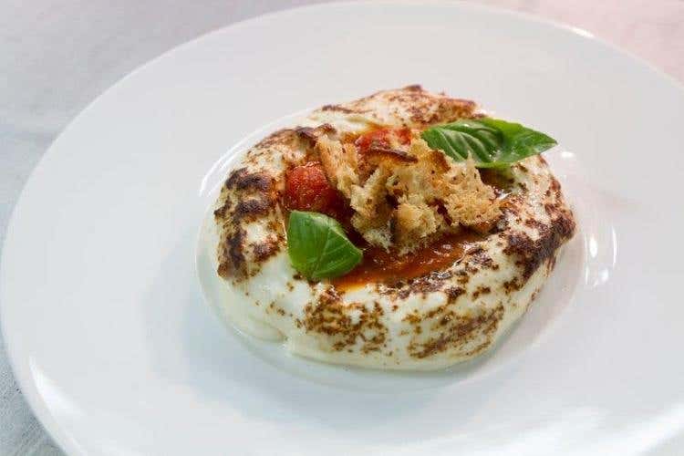 Qui propone La pizza al contrario. Il disco è costituito dalla mozzarella e il topping è costituito dall'impasto. Proprio buona questa pizza al contrario! Considerando di forma ellittica il territorio campano della mozzarella di bufala, dal fuoco ellittico settentrionale, ovvero il Casertano, ci si muove adesso al fuoco ellittico meridionale, ovvero la Piana del Sele. Il terzo chef stellato è