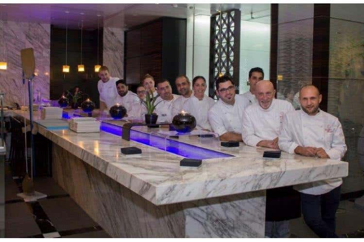 Da sinistra: Salvatore Bianco, Rosanna Marziale, Giuseppe Stanzione, Salvatore Salvo, Fausto Arrighi, Pasquale Palamaro, Vincenzo Guarino, Crescenzo Scotti e Gianfranco IervolinoLo chef stellato è